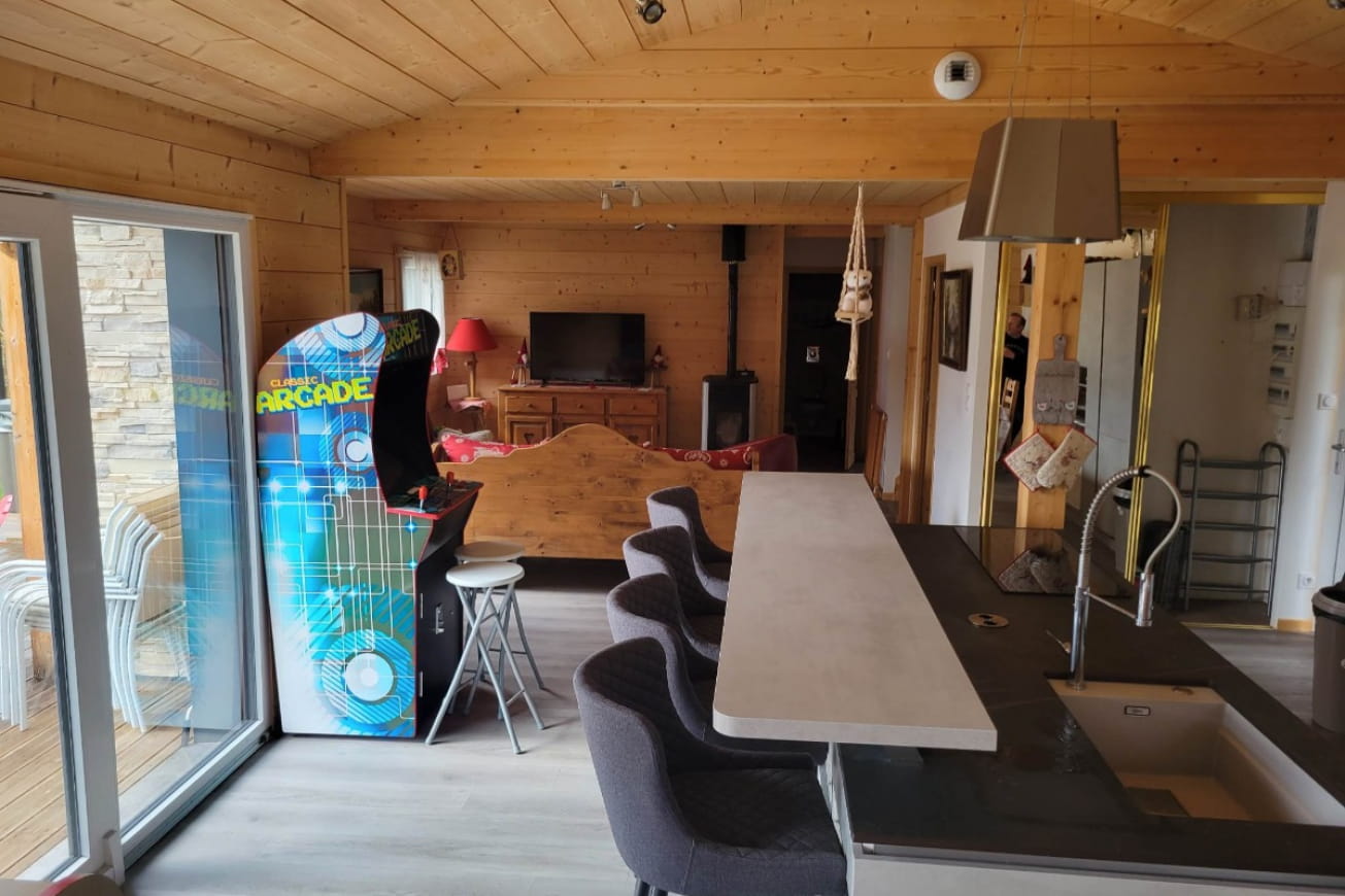 Au rez-de-chaussée, vous aurez accès à la cuisine ouverte sur un grand salon / séjour (avec baby-foot et borne d arcade jeux vidéo).