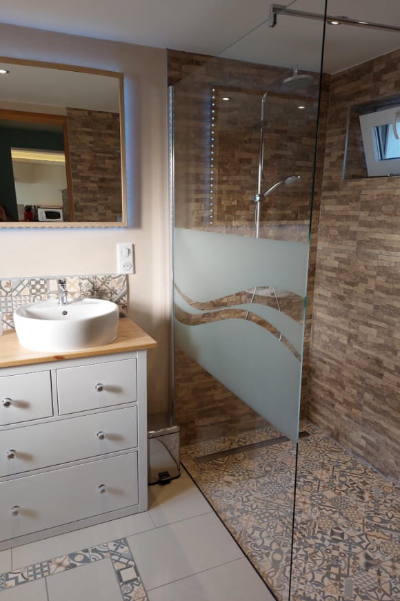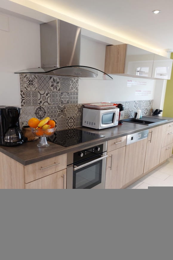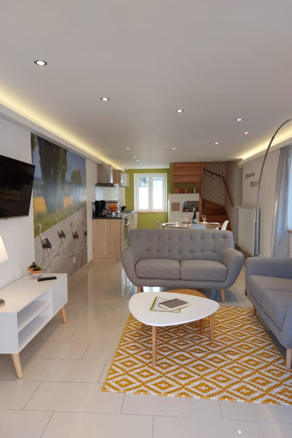 Au rez-de-chaussée une cuisine aménagée ouverte sur salle à manger et salon. Une grande salle d’eau avec douche italienne et WC indépendant. Divers équipements de confort : TV, Internet, lave-linge, sèche-linge, lave-vaisselle…