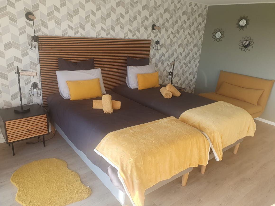 Totalement rénové en 2021, le gîte peut accueillir jusqu’à 6 personnes dans un espace de 90 m² parfaitement aménagé. 2 chambres au rez-de-chaussée, chacune équipée de lits simples et d’un fauteuil convertible, disposent de leur salle d’eau et WC privatifs. À l’étage, une vaste pièce à vivre lumineuse réunit cuisine équipée, salon et salle à manger, avec un accès direct à une terrasse aménagée.