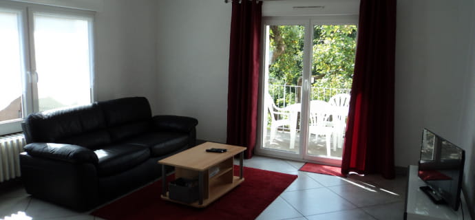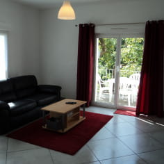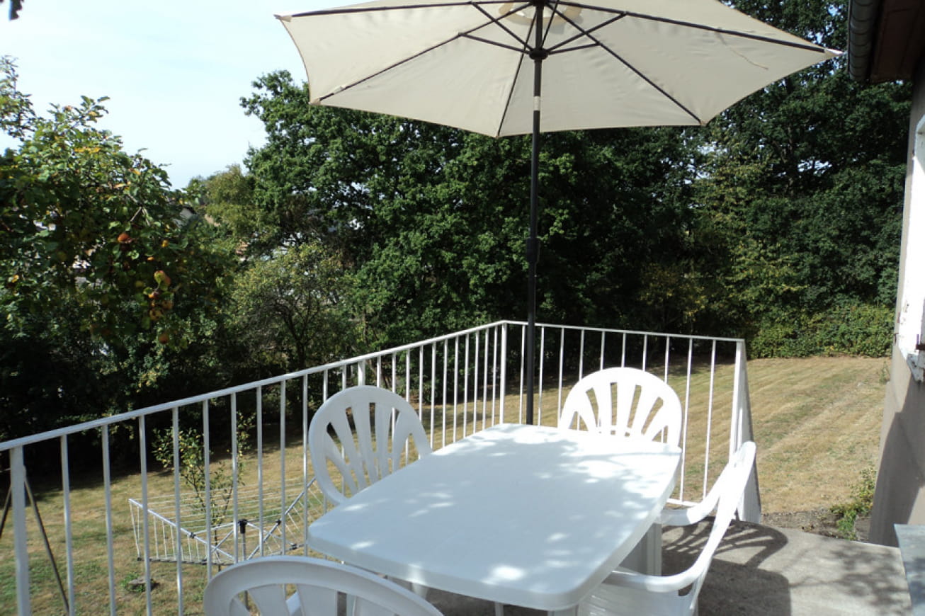 Terrasse donnant sur le jardin, barbecue.