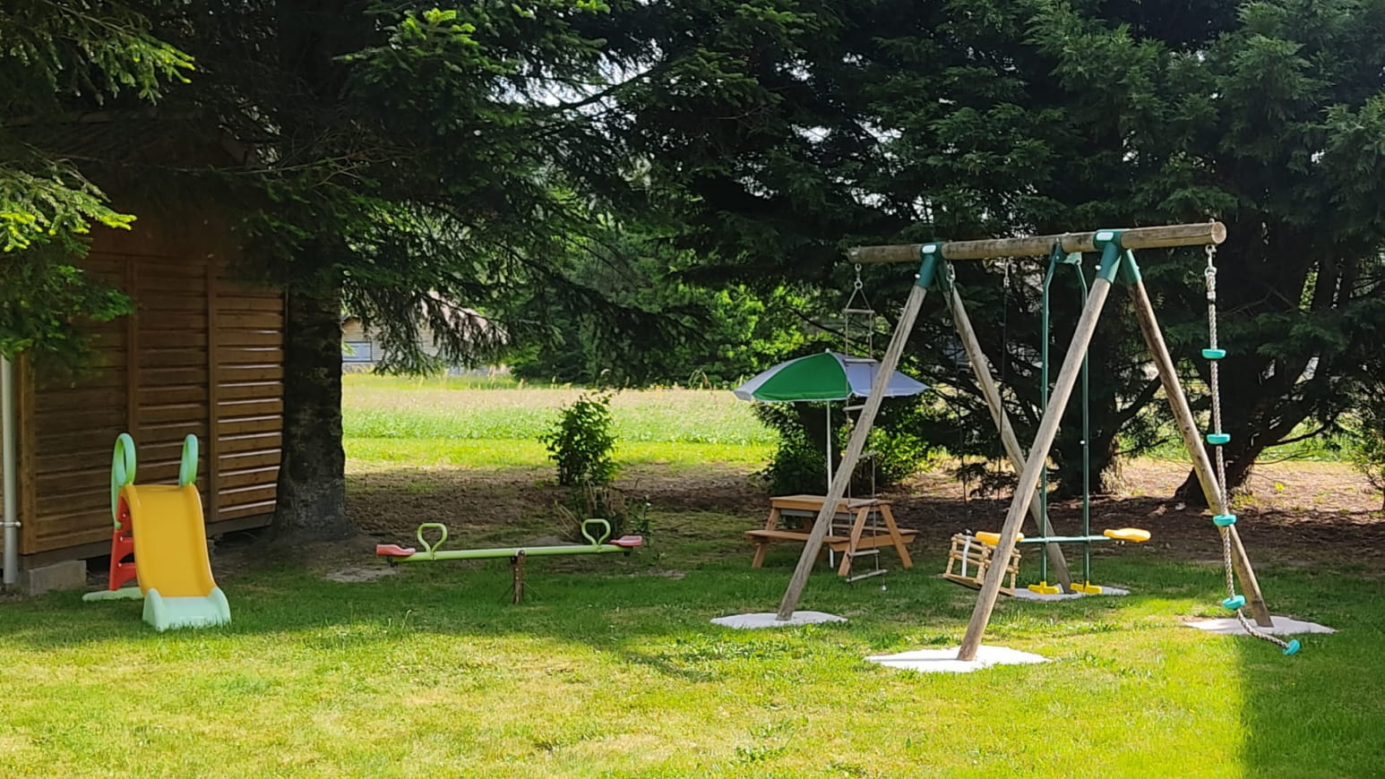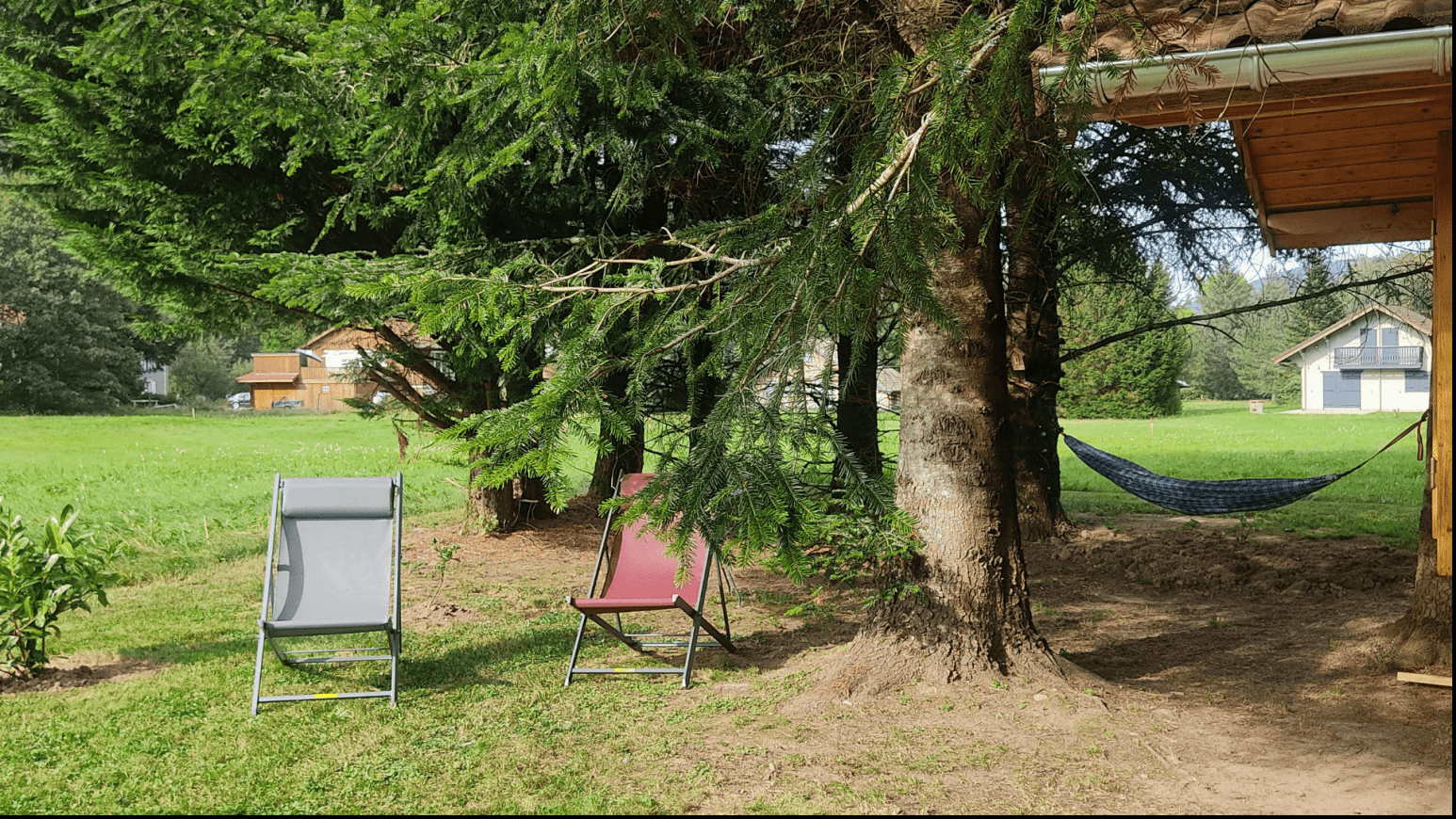 - Espace détente sous les sapins avec chaises longues, hamac et jeux pour pour les enfants