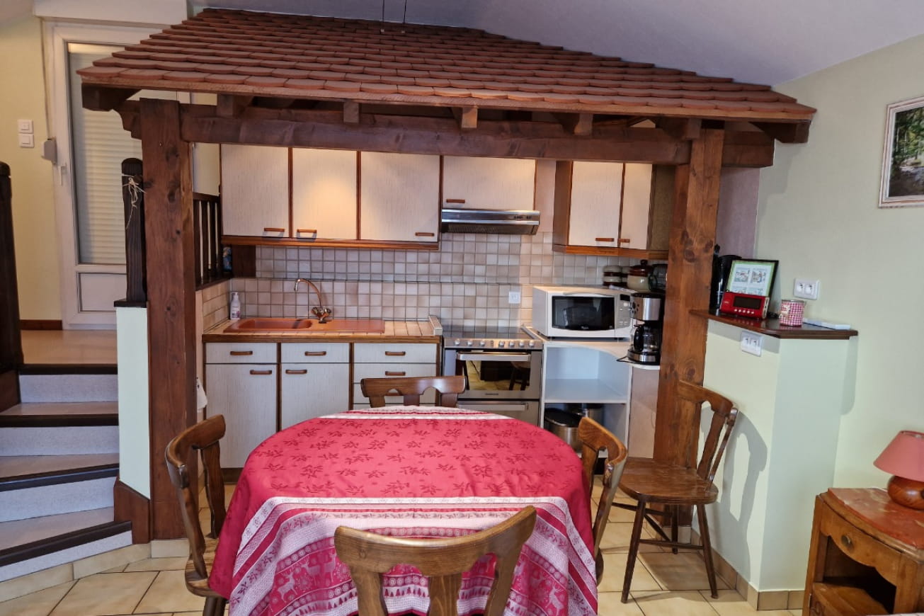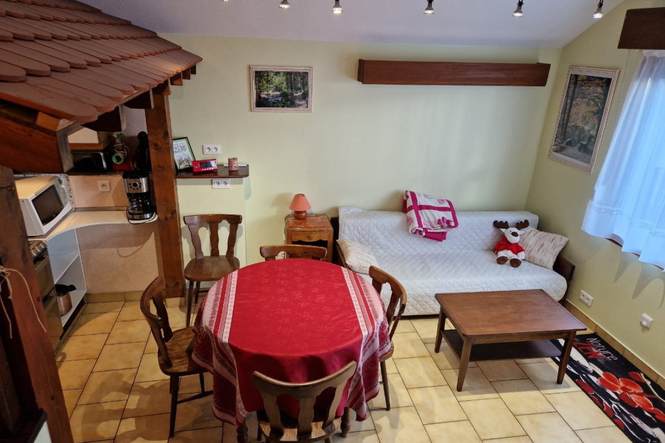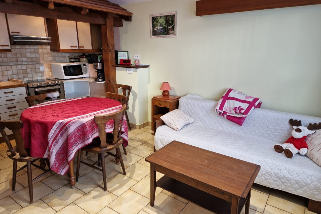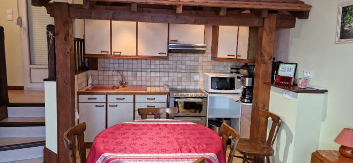 Pièce principale avec espace cuisine toute équipée dont four électrique, 3 feux 1 plaque, four micro-ondes, cafetière électrique, théière, lave-vaisselle, réfrigérateur congélateur et séjour avec TV, canapé lit gigogne, jeux de société, services pierrade raclette et à fondue. Wifi gratuit.