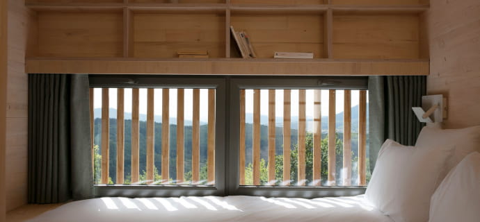 -Eføy hyttes : superbe tiny house avec une architecture originale et un intérieur cosy et épuré. La hytte Eføy est la promesse d’un hébergement fonctionnel de prestige. Si la salle de bain se cache au coin, la pièce de vie est dominée par une large baie vitrée avec vue imprenable. Ciblant les plus exigeants, un bain nordique privatif vient en option dans la hytte « Eføy et Bain nordique ».
