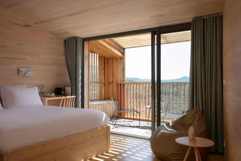 Sur un site dominé par la nature, 48°Nord allie liberté, confort et bien-être avec des hyttes haut de gamme, un restaurant bio, un bar, un spa et espace détente. Les logements sont en bois brut et proposent des lignes épurées avec une finition bien soignée.