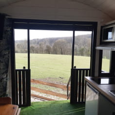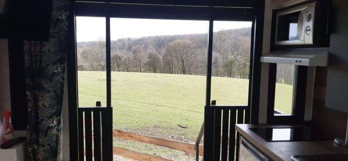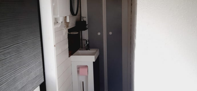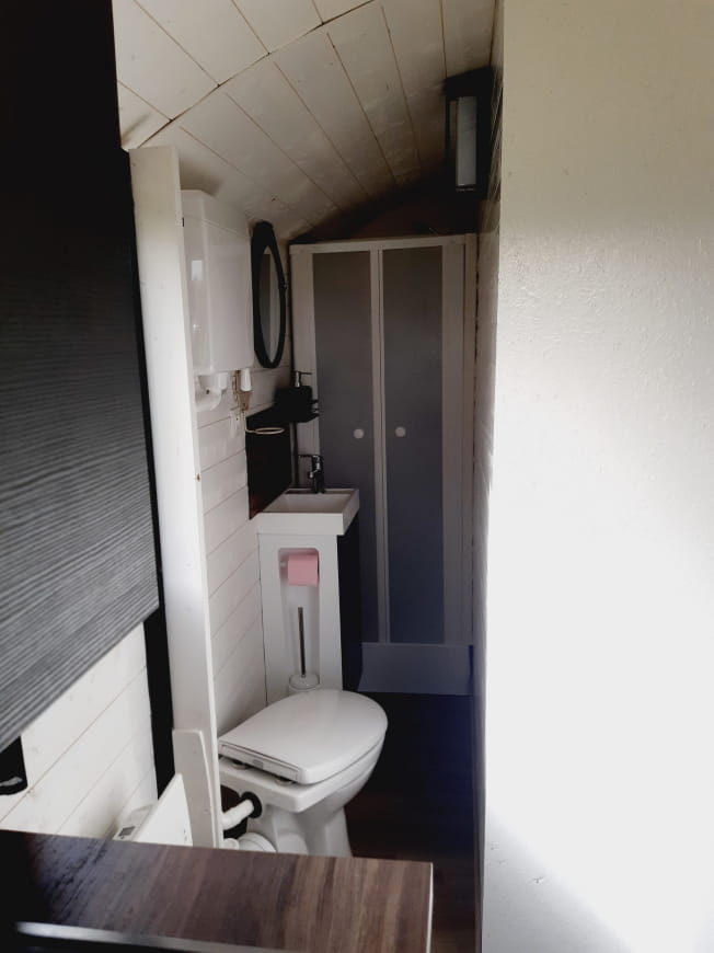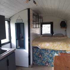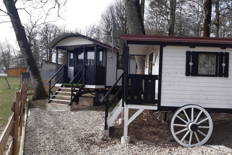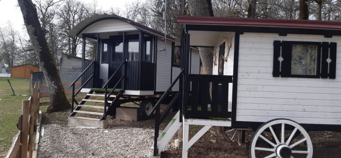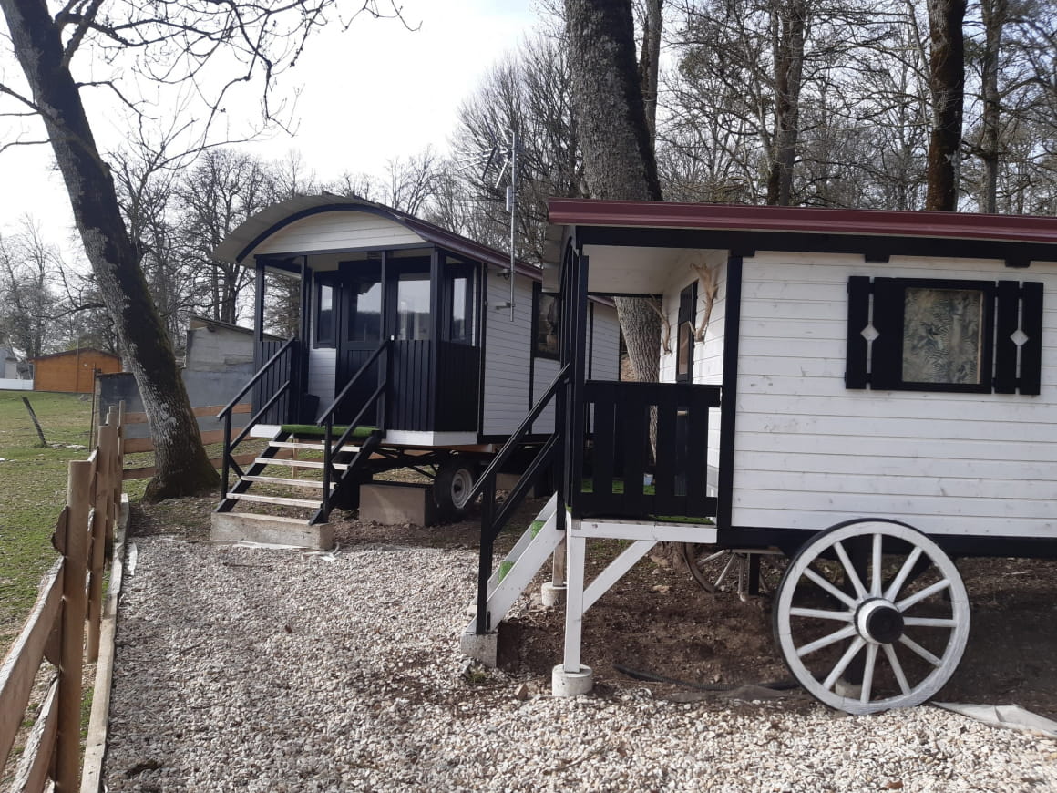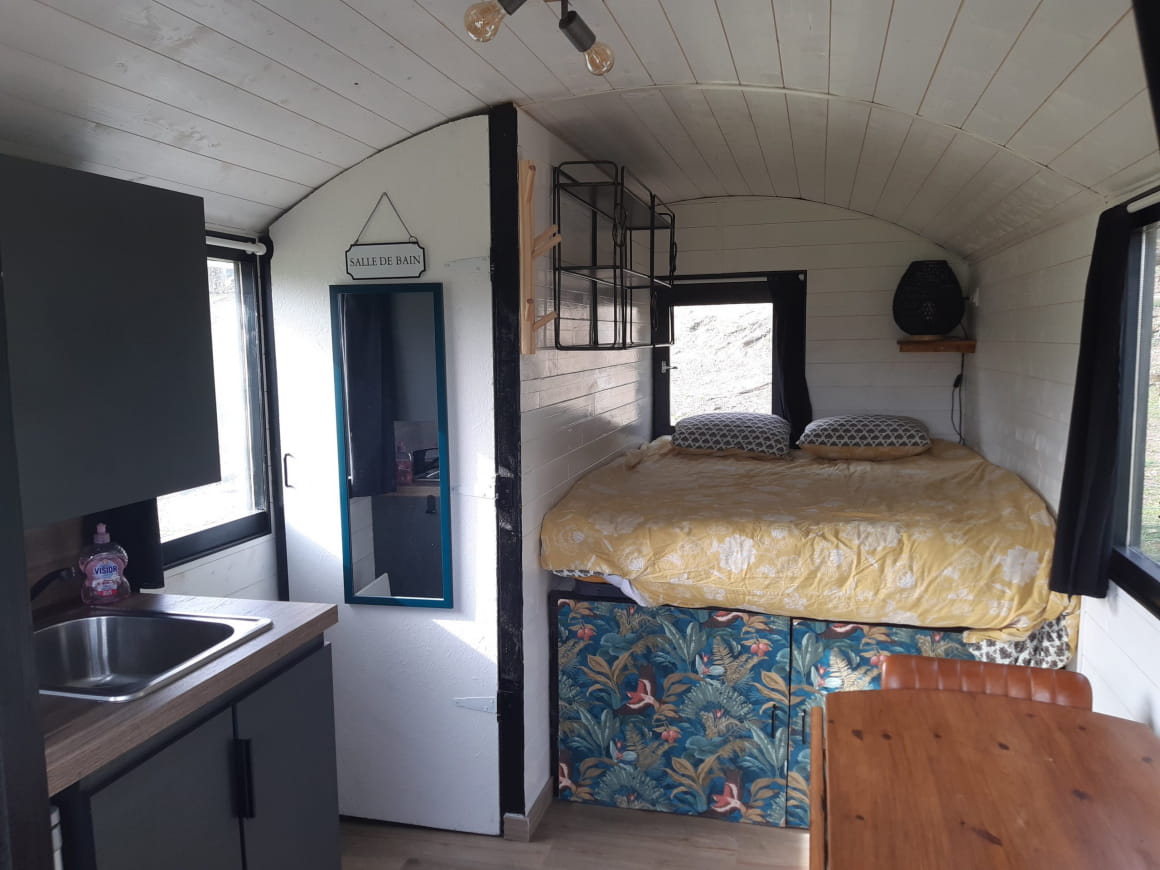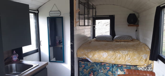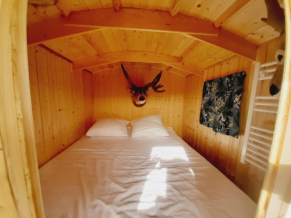 A noter que la petite roulotte comporte un lit en 140cm classique mais il n’existe pas de communication intérieure entre la grande et la petite roulotte.