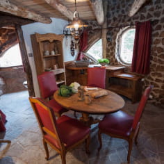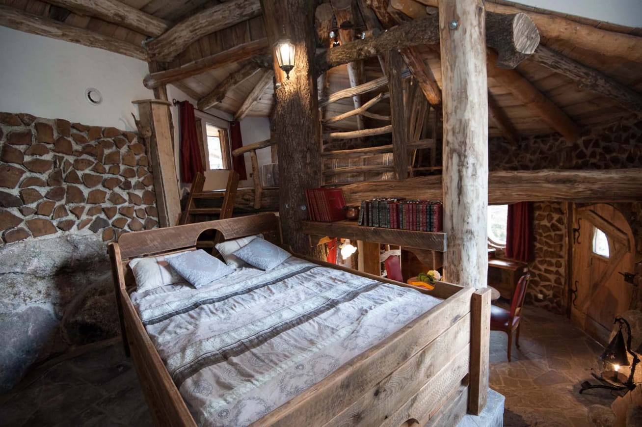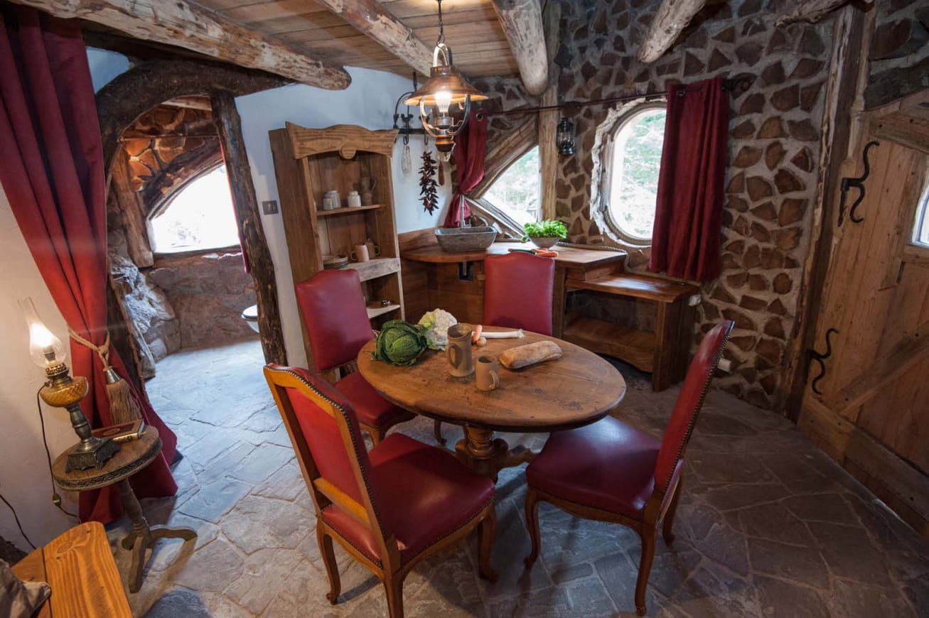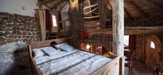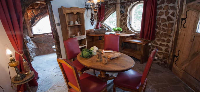 Inspirée de la vraie maison du Hobbit, cette cabane semi-enterrée vous transportera dans l’univers extraordinaire de la Terre du Milieu. Dès que vous passerez le seuil de la porte, vous vous retrouverez dans un monde à part, où l’alliance du bois et des roches enchante le décor.