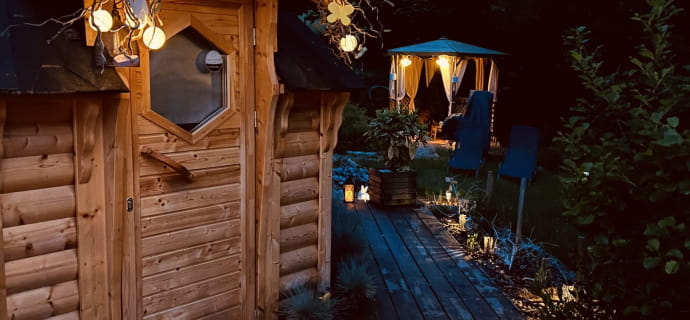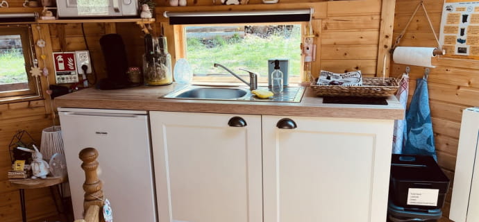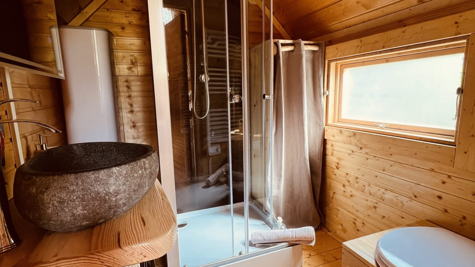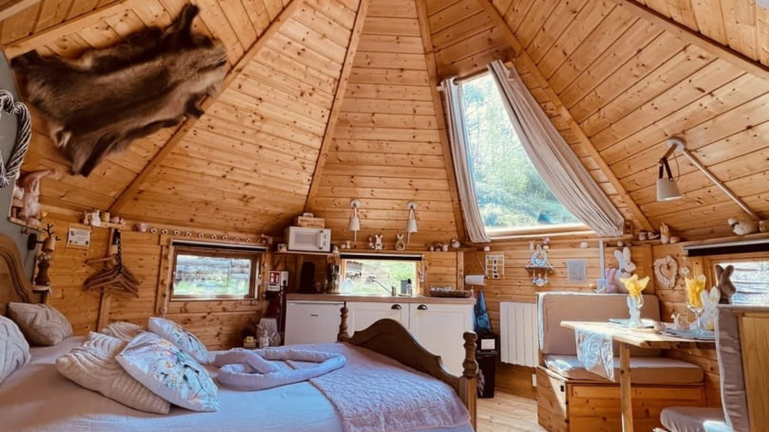 Pour une détente totale, vous pourrez profiter durant tout votre séjour d’un bain nordique accessible en illimité et chauffé exclusivement au bois. Ce chalet en bois, de forme hexagonale, se distingue par son charme authentique et ses équipements modernes. Le Kota Désiré allie en effet tradition et confort : vous y trouverez un grand lit double (160×190), ainsi qu’un lit d’appoint pouvant accueillir jusqu’à 3 personnes. Une cuisine équipée est à votre disposition pour préparer vos repas, avec des dosettes de café, thé, tisanes et condiments fournis. La salle de bain indépendante est dotée d’une élégante vasque en pierre et de toilettes sèches. Le linge de lit et de toilette est également inclus.